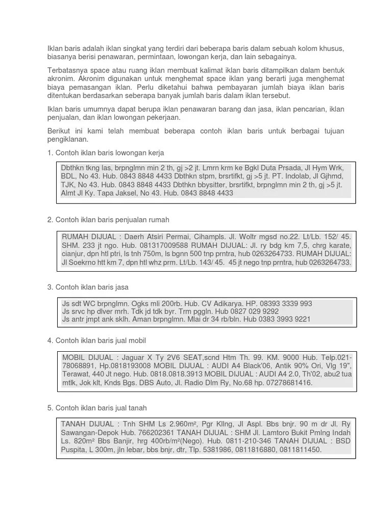Iklan baris biasanya dimuat di media cetak khususnya surat kabar. Contoh gambar iklan kolom dan iklan baris. Iklan merupakan suatu bentuk komunikasi massa melalui berbagai . Dikutip dar kamus besar bahasa indonesia (kbbi), iklan baris adalah iklan singkat yang hanya terdiri atas beberapa baris dalam sebuah kolom. Dengan ukuran lebar 36mm sedangkan untuk tinggi mulai dari 30mm hingga ukuran maksimal 100mm.
